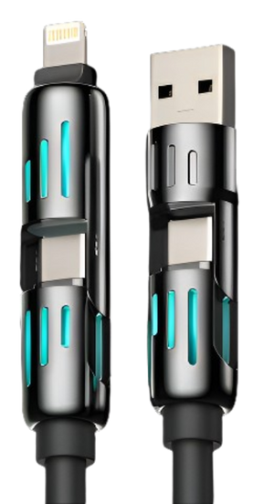 كابل الشحن 4 في 1 يُبقي جميع أجهزتك مشحونة بسرعة وسهولة. تخلّص من الأسلاك المتشابكة واحصل على كابل واحد أنيق يُناسب جميع احتياجاتك - آيفون، أندرويد، الأجهزة اللوحية، وغيرها. كابل واحد. راحة تامة.